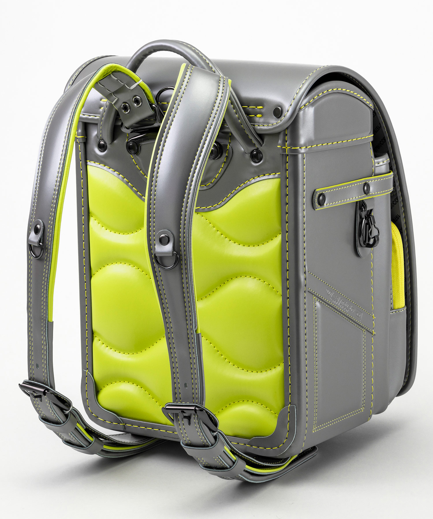金具を押すだけで自動的に鍵が閉まるミラくるっロック®を搭載。施錠の手間を省き、締め忘れをゼロに。肩ベルト底面のダルマカン部分が左右に動かせる仕様になっているため、成長や体型、服の厚みに合わせてフィットしやすく、背負う際にもらくに腕を通せます。