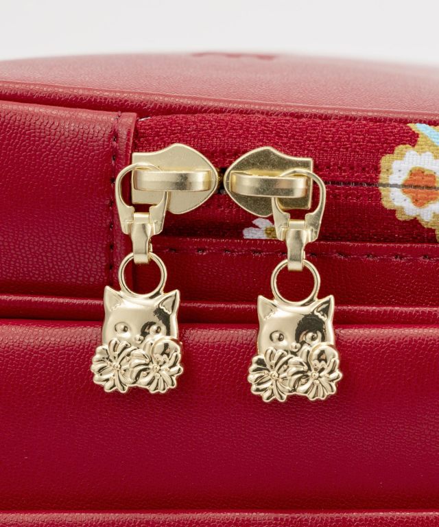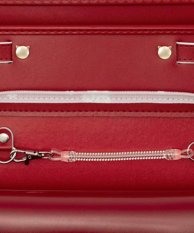 持ち手:収納や持ち運びに便利な持ち手付き。肩ベルトDカン:防犯ブザーに手が伸ばしやすい肩ベルトにDカンを装備。内ポケット伸縮フック:ファスナーポケット内部に、伸縮性のあるフックを搭載。家の鍵などが見つかりやすく、紛失しにくい仕様に。